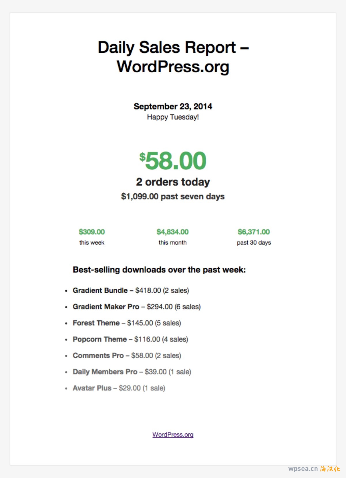 EDD 电子邮件报告通过获取您商店的所有重要统计数据并将它们打包到详细的销售报告电子邮件中来解决这个难题,该电子邮件总结了您的产品在当天、一周、一个月以及连续 7 天和 30 天的销售情况。