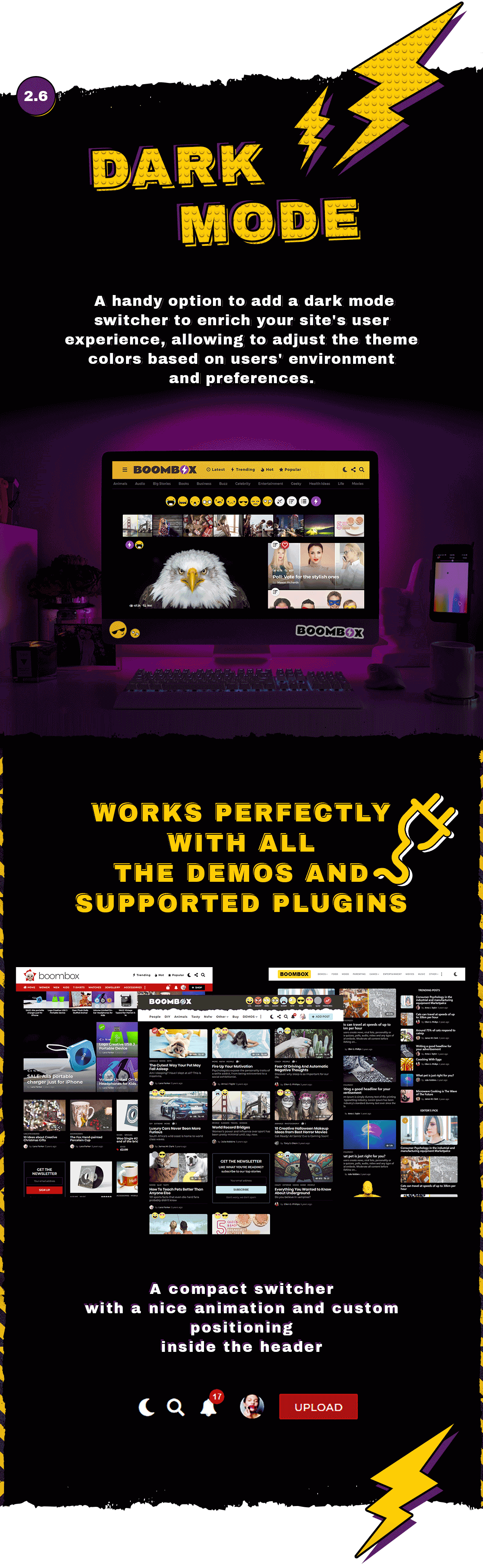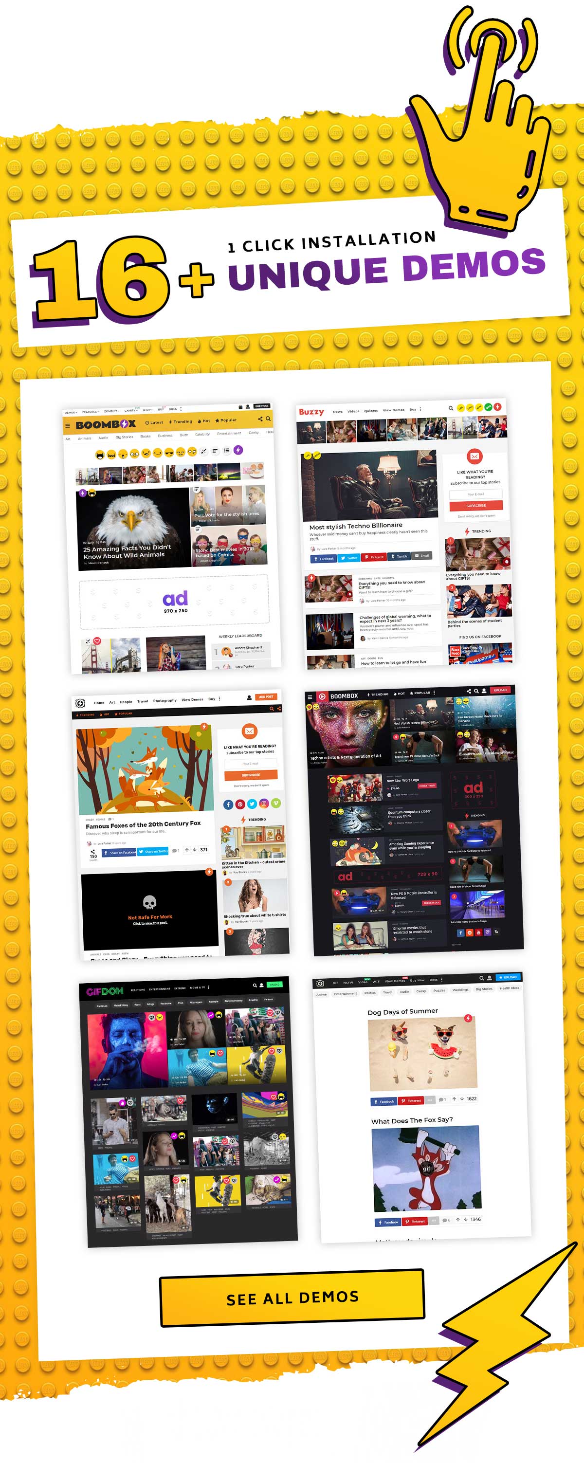 Boombox 是一款多功能病毒式杂志主题,具有一流的设计和高度可定制的布局,充满了病毒式小吃和独家功能,由最强大的病毒式内容构建器提供支持。填充新闻、列表、民意调查或测验,通过社交分享、趋势、反应和赞成/反对投票系统传播它们,推动博客社区并通过任何类型的广告获利。列表、gif、病毒式、社交分享、rtl 杂志、博客、测验、民意调查、反应、图库、趋势