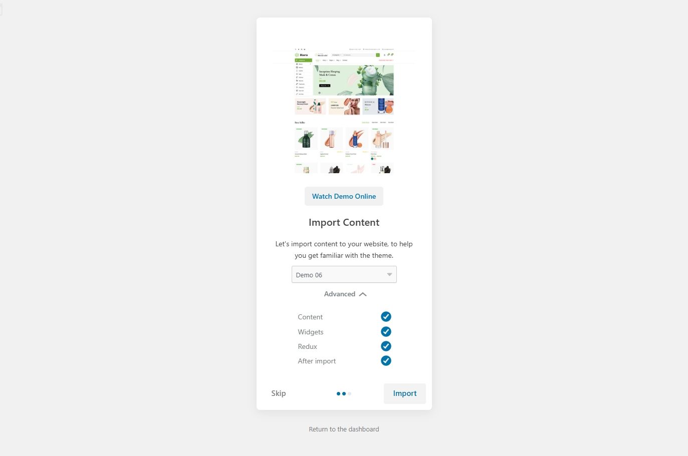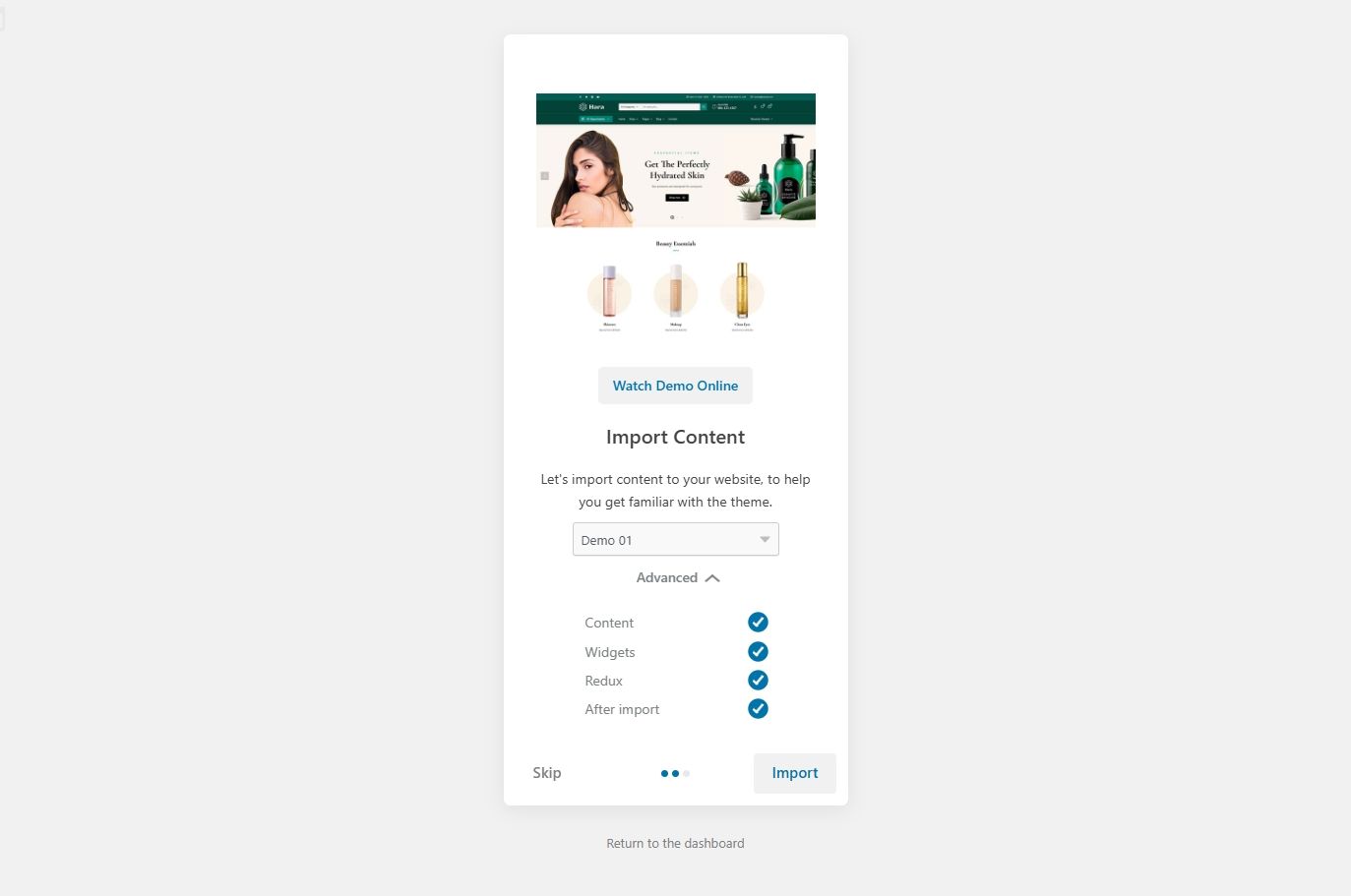 - 一键演示内容导入:通过一键导入功能,您可以快速设置网站,节省大量时间。无论是产品页面还是联系页面,您都可以轻松复制演示内容,快速上线。