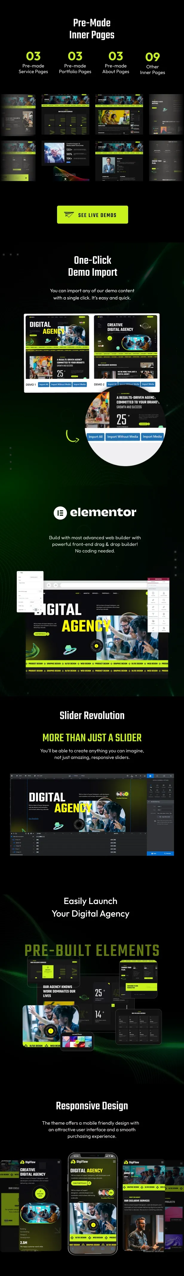 DigiFlow是一款专为创意专业人士、数字机构、自由职业者和作品展示网站设计的WordPress主题。兼容最新的WordPress版本,DigiFlow利用强大的Elementor页面构建器,让用户轻松创建令人惊艳的全响应式网站,无需任何编码知识。无论是展示作品集、推广机构服务还是启动个人创意网站,DigiFlow都能提供完美的解决方案,帮助用户建立专业的在线形象。