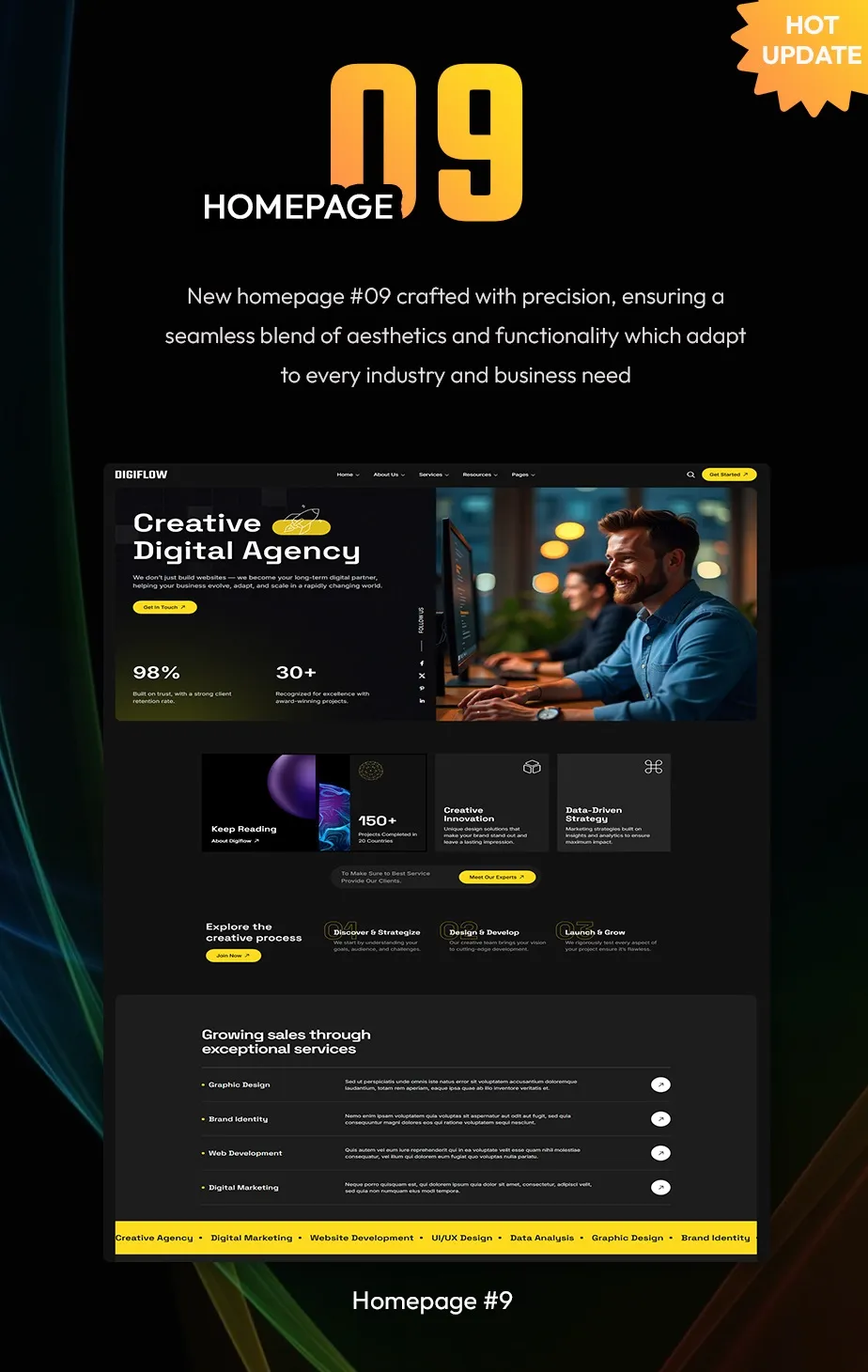 - 多样化的首页布局:DigiFlow提供9种优雅的首页布局,用户可以根据自己的品牌形象选择适合的设计。这些布局经过精心设计,确保能够有效展示创意作品和服务。