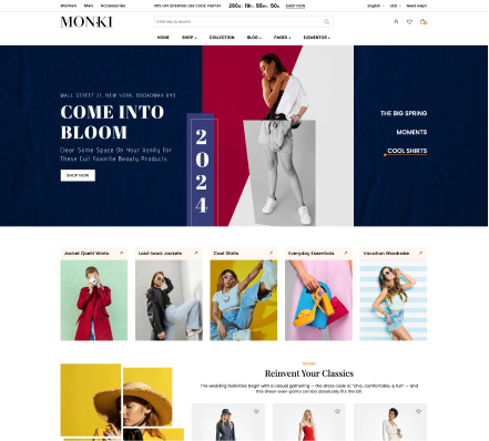 - 12 种优雅的首页布局:Monki 提供多达 12 种精美的首页设计,用户可以根据自己的品牌形象和产品类型选择最合适的布局,轻松吸引顾客的注意。