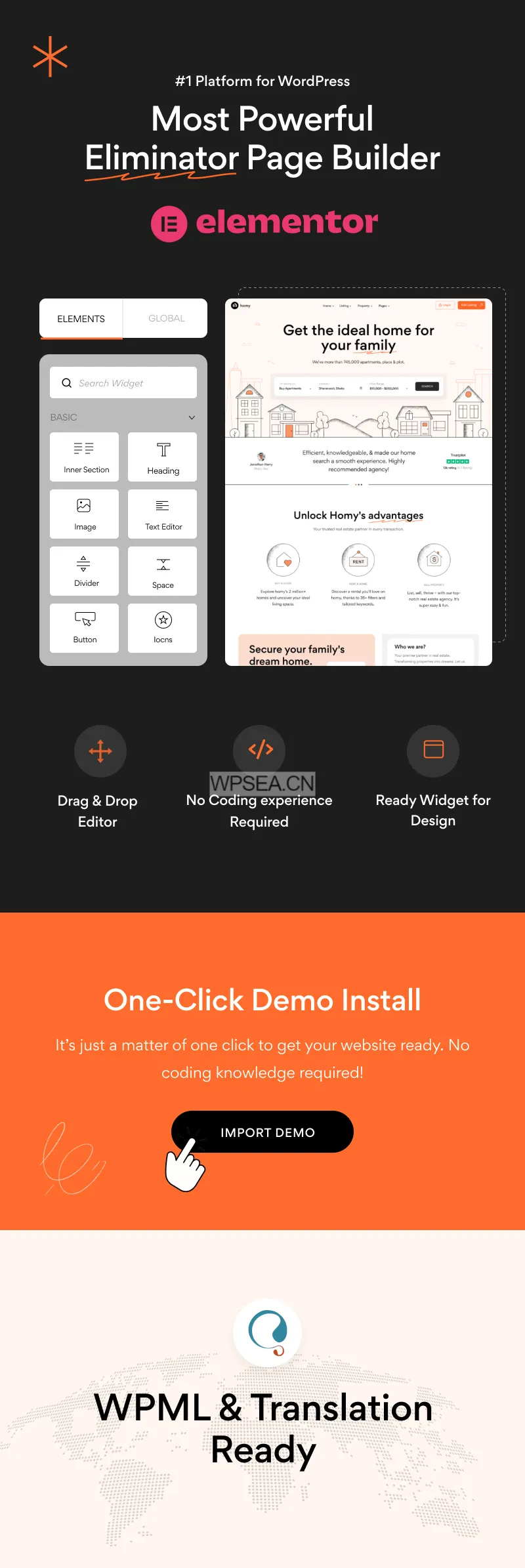 Homy 打包即用,支持通过 FTP 或 WordPress 快速安装。激活后,您可以加载演示内容,然后在已设计好的页面上添加自己的内容。