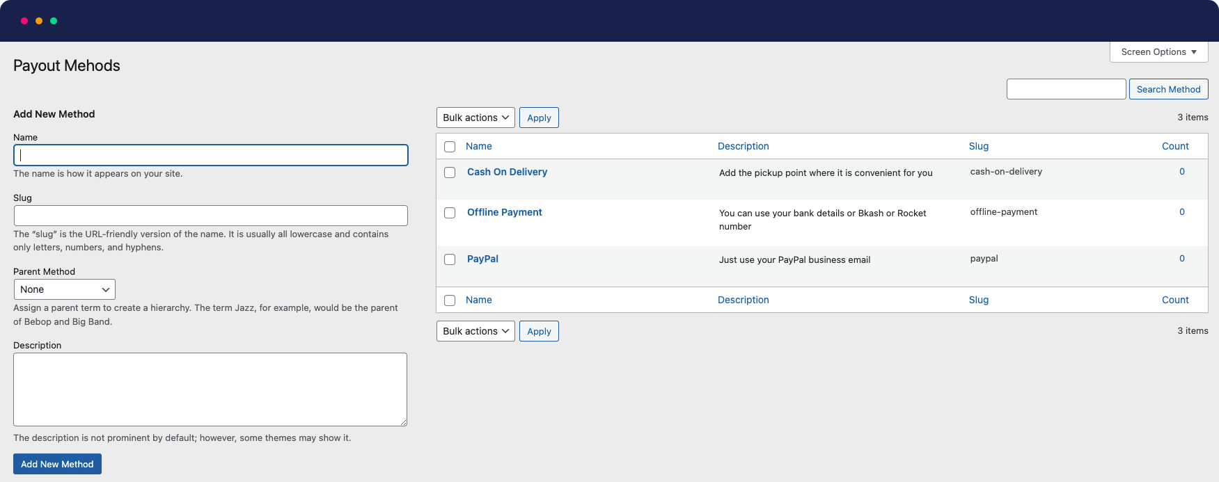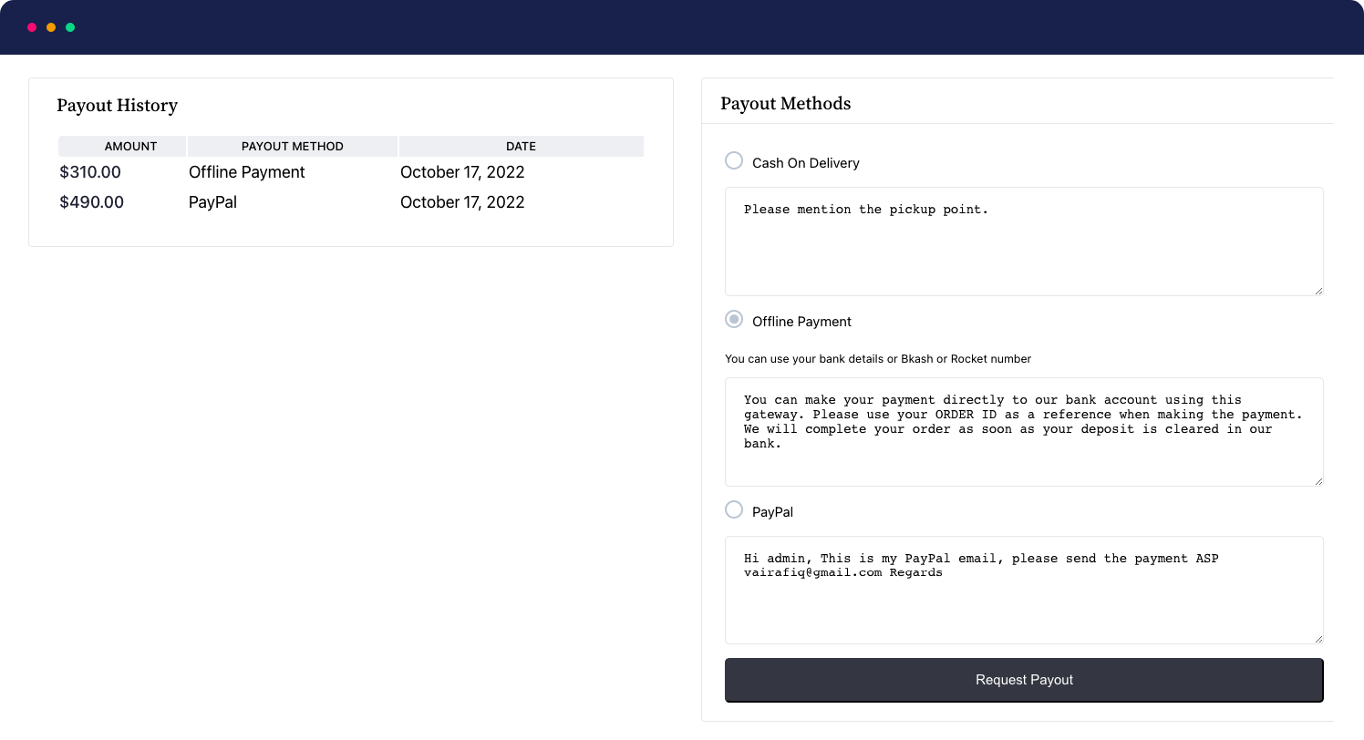 - 多种支付方式:管理员可以定义多种支付方式,供应商可以选择他们的首选支付方式进行请求。