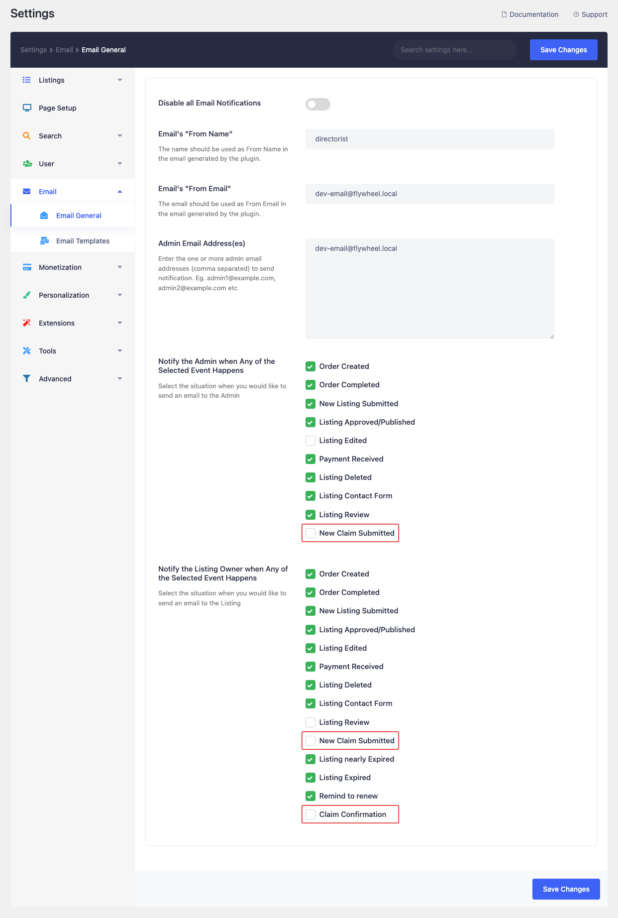 - 邮件通知功能:您可以选择启用或禁用在认领请求被提交、批准或拒绝时向管理员和申请者发送邮件通知。