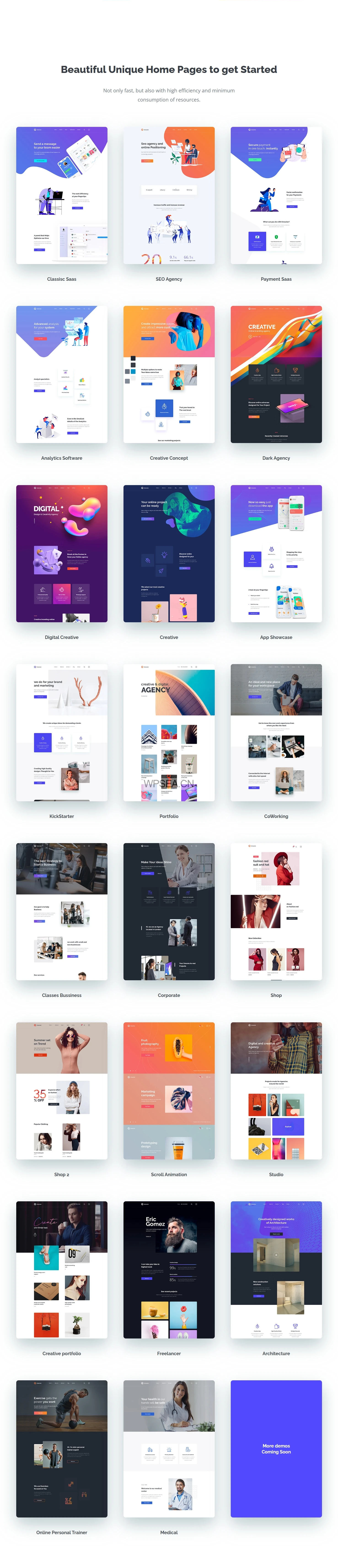 Octavian内置23个独特的演示模板,每个模板都有其独特的布局、滑块和元素,帮助您快速创建任何类型的网站。您也可以选择从零开始构建。