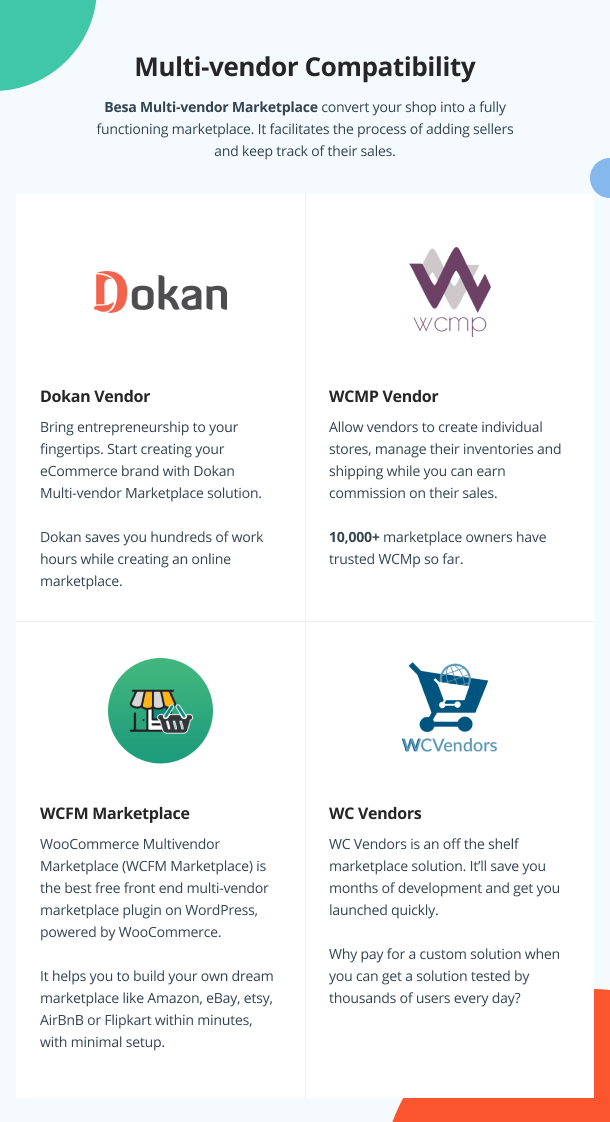 - 多供应商市场支持:兼容 Dokan、WC Marketplace、WCFM 和 WC Vendors,轻松创建多供应商市场。