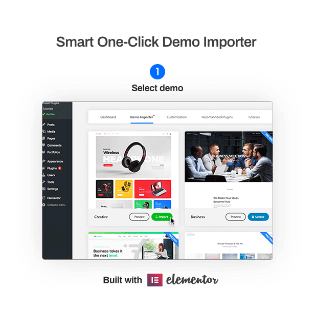 作为市场上最兼容的 Elementor 主题,Phlox Pro 在 Elementor 官方推荐页面中名列前茅。所有演示均可通过简单的几次点击导入,用户可以选择导入整个演示内容或仅部分内容,操作简单快捷。