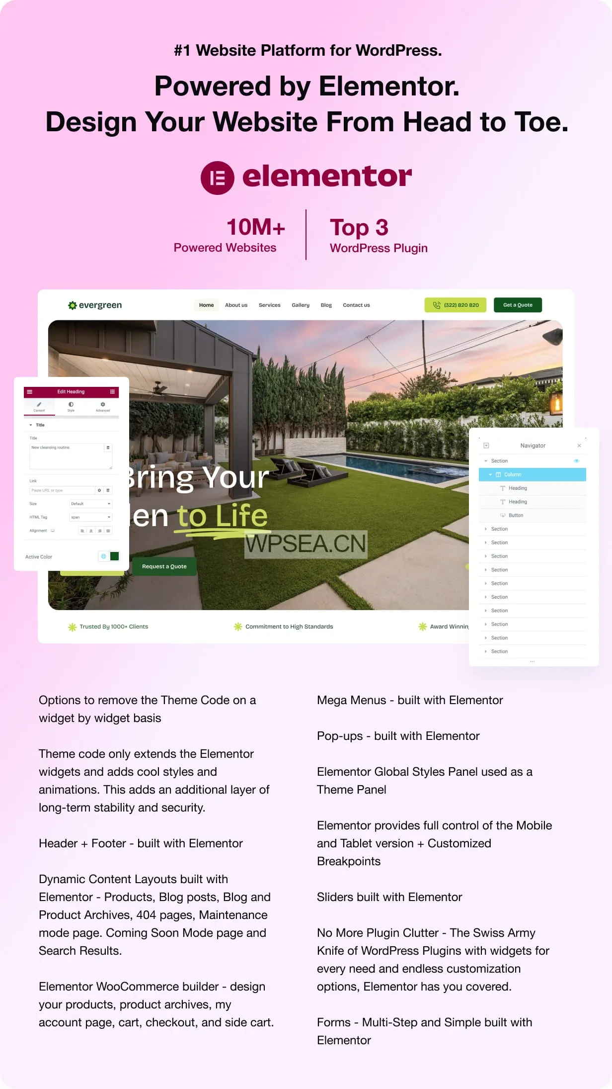 EverGreen与Elementor及Elementor Pro完美兼容,使您能够轻松构建视觉上令人惊叹且完全可定制的网站。请注意,使用演示内容导入器和主题设置时需要Elementor Pro。