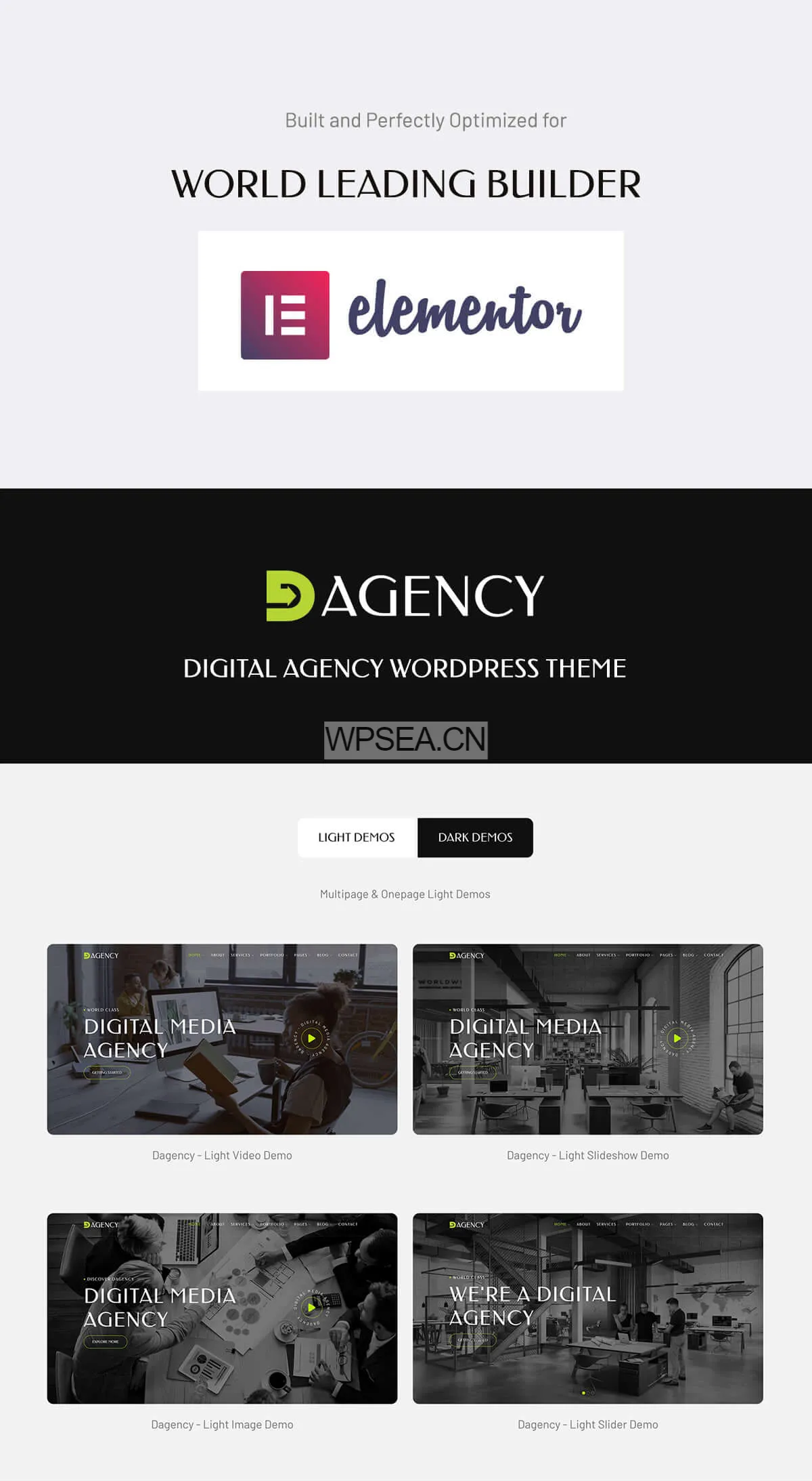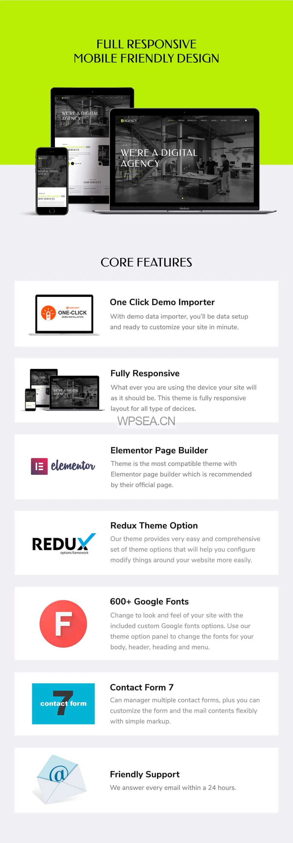 Dagency 主题采用 Elementor 构建,这是一款非常方便的拖放式页面构建器,能够为用户提供流畅的建站体验。无论您是初学者还是经验丰富的开发者,都能轻松创建出符合需求的网站。该主题的响应式设计确保在不同设备上都能保持良好的视觉效果。