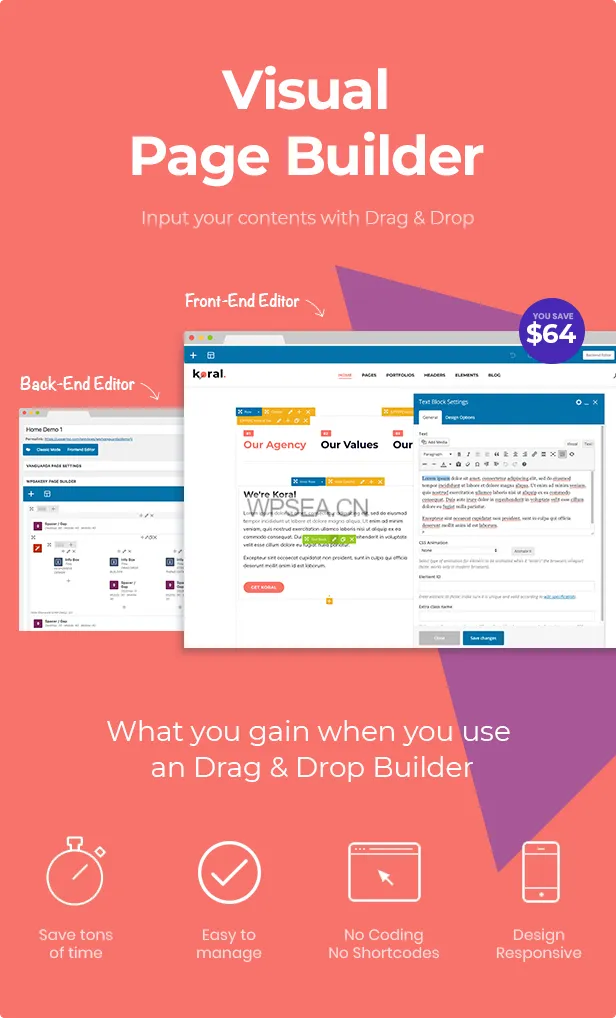 Koral集成了WPBakery页面构建器和Revolution Slider,用户无需编程知识即可创建复杂的页面布局和动态效果。这些工具的价值分别为64美元和29美元,极大地提升了主题的性价比。