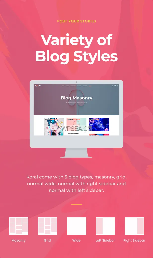 主题提供了丰富的自定义选项,包括无限颜色和样式选择、多个博客设计和高级搜索选项。Koral还经过SEO优化,帮助用户提高网站在搜索引擎中的排名。