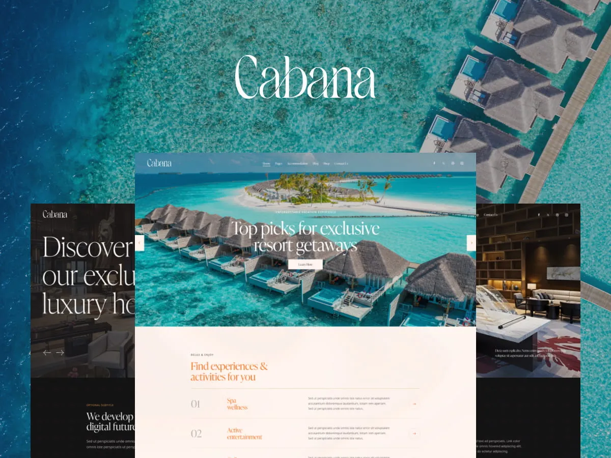 Cabana 是一款生动而阳光明媚的 WordPress 主题,专为度假村、酒店连锁、静修中心、城市海滩、海滩俱乐部、户外游泳池俱乐部、夏季度假网页或水上乐园而设计。无论您是经营水疗度假村、健康中心、旅行社还是旅游杂志,Cabana 都能满足您的需求。