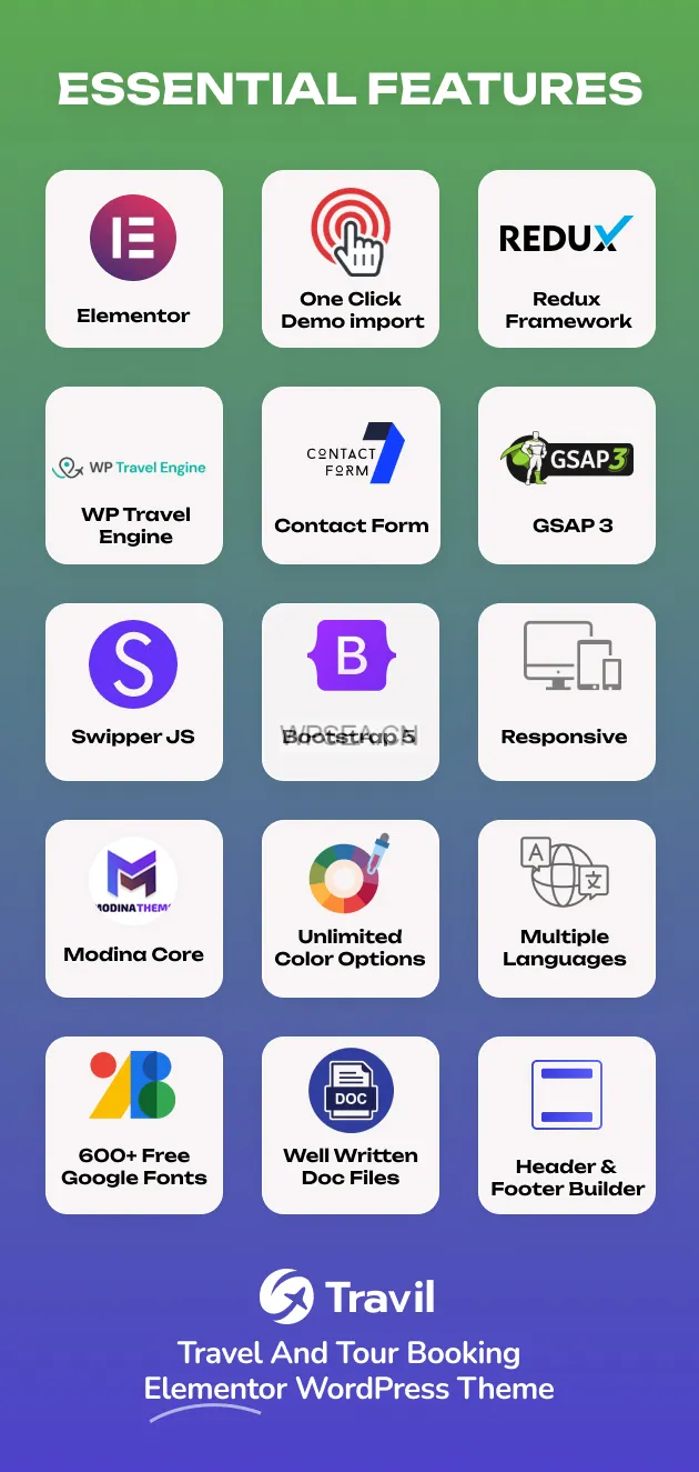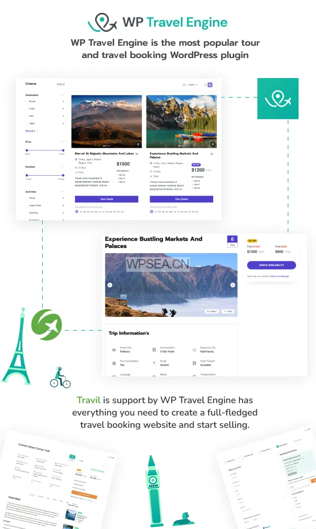 Travil 与 WP Travel Engine 插件完全兼容,后者提供创建完整旅游预订网站所需的一切功能,助您快速开始销售。