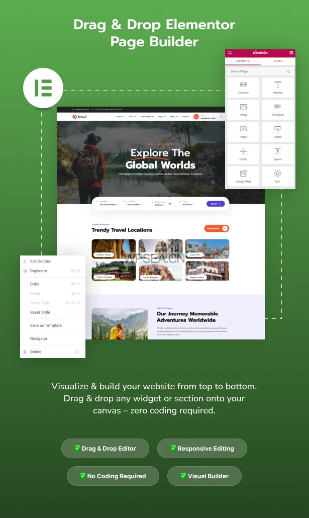 Travil 配备快速、直观的拖放页面构建器,简化了您的自定义过程。只需几分钟,您就可以完成布局的发布!