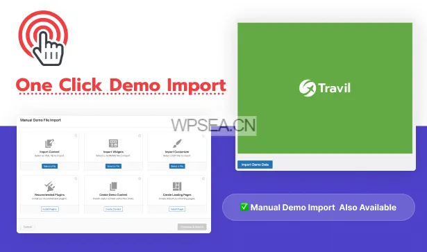 通过强大的“一键演示安装程序”,您可以快速安装 Travil。只需一次点击,即可导入一个已准备好的旅游网站,包含所有页面、图片和内容。
