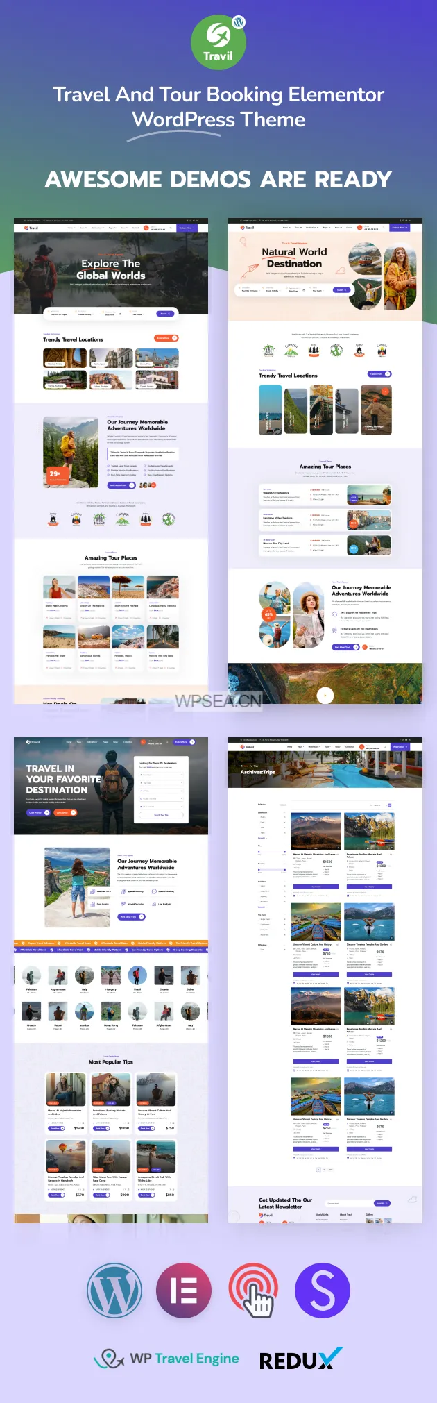 Travil 提供三种专业设计的演示布局,针对不同的旅行业务需求量身定制。这些演示使用 Elementor 构建,使您无需任何编码知识即可轻松自定义每个部分。